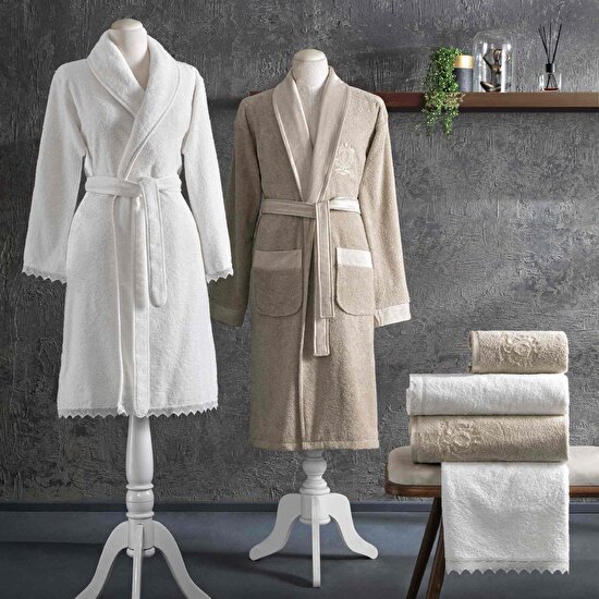 Taç Sambre Pamuk Aile Bornoz Seti Beyaz Cappucino